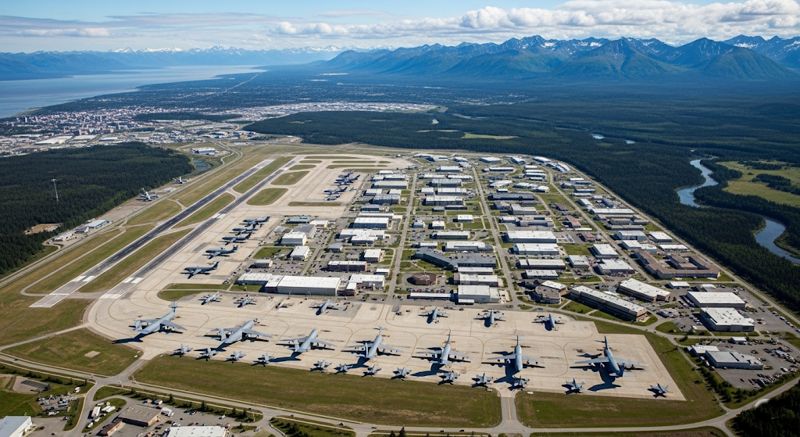 - Flyvepladsen er et centralt element, med C-17 Globemaster III-transportfly og F-22 Raptor-kampfly, der er typiske for basen.