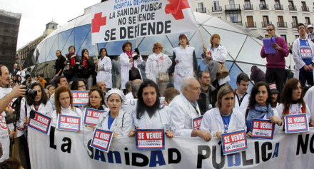 I Madrid var der en protest ved Cibeles-rundkørslen overfor den spanske centralbank samtidig med, at forskellige grupper af personer marcherede af sted fra byens 27 sygehuse for at slutte sig sammen i en demonstration på den centrale plads, Puerta del Sol.