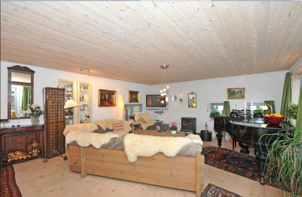 H'ets højre side indeholder den store opholdsstue, ligeledes med brændeovn, fordelingsgang, 3 soveværelser og badeværelse.
