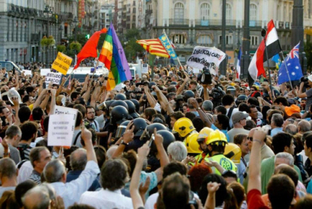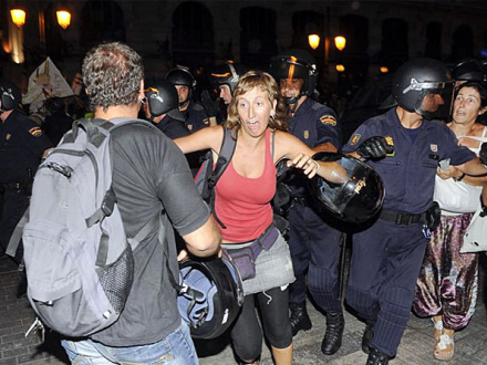 Seks personer blev anholdt og 11 såret, der i blandt to betjente. Optøjerne startede da politiet kort efter kl. 23 forsøgte at rømme det centrale torv, Puerta del Sol, hvor demonstranterne havde forsamlet sig.