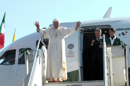 Kl. 9:40 startede Paven i sit special-indrettede Alitalia-fly fra Ciampino Lufthavnen ved Rom. Paven landede kl. 11:45 i Barajas-lufthavnen i Madrid.