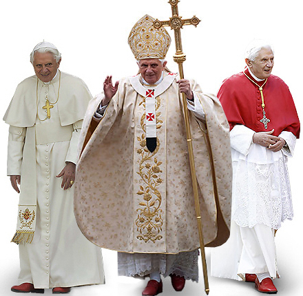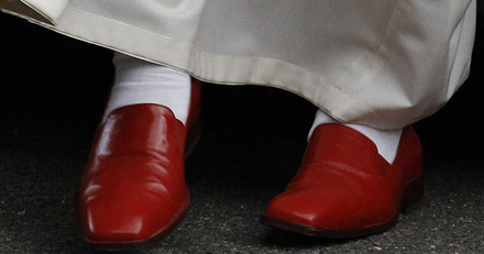 Skoene er noget af det mest karakteristiske ved Benedicto XVI's påklædning. Pavens sko blev valgt som årets accessory i bladet Esquire i 2007. Skoene er lavet af ko- og gedeskind og er i størrelse 42. De er håndlavede af skomageren, Adriano Stefanelli, som har afsløret, at Benedicto XVI har valgt en mere levende rød farve end Juan Pablo II, så de bedre symboliserer Jesu Kristi blod.