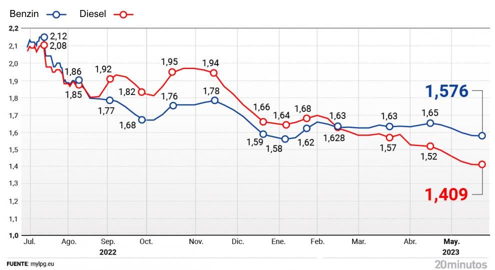 Ifølge data fra den seneste European Union Oil Bulletin, som viser den gennemsnitlige pris på mere end 11.400 spanske tankstationer mellem den 16. og 22. maj, koster det 70,45 euro at fylde en gennemsnitlig 50-liters tank med diesel. Omkostningerne stiger til 78,8 euro for benzin, som i øjeblikket er den dyreste løsning. For en 60-liters tank skal der betales henholdsvis 84,54 og 94,56 euro, og under alle omstændigheder mindre end 95 euro.