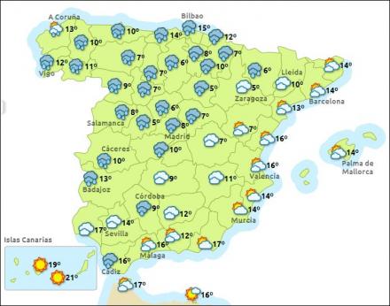 I Galicien er der varsel om otte meter høje bølger, og langs Middelhavskysterne op til fem meter. Men derudover bliver det også koldt, og der er generelt udsigt til kraftigt faldende temperaturer over hele landet.