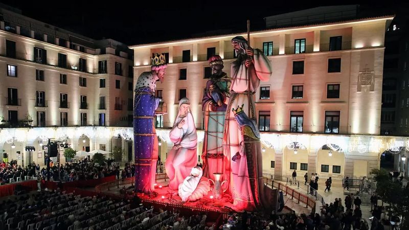 Figurerne på mere end 10 meter, bortset fra Jesusbarnet, er i år placeret på Plaza del Ayuntamiento i Alicante.