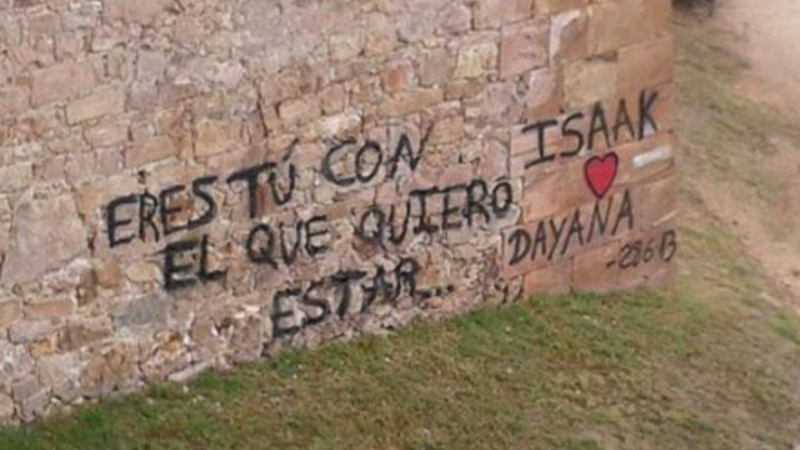 Et ungt kæreste-par, Isaak og Dayana, samt to andre par skal betale en bøde på 2.250 euro for at tegne et hjerte og skrive deres navne på det historiske slot Castillo de Montjuïc i Barcelona.