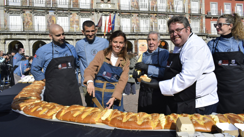 Plaza Mayor var rammen for Asociación de Cocineros y Reposteros de Madrid, ACYRE Madrid, der vanen tro tilberedte en gigantisk Corona de La Almudena, som blev serveret i tusindvis af portioner til offentligheden.