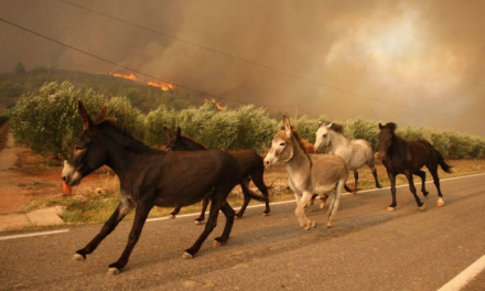 Både mennesker og dyr flygter fra flammerne
