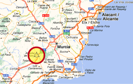 Alhama de Murcia ligger 38 km. fra Murcia, 109 km. fra Alicante, 373 km. fra Málaga og 425 km. fra Madrid