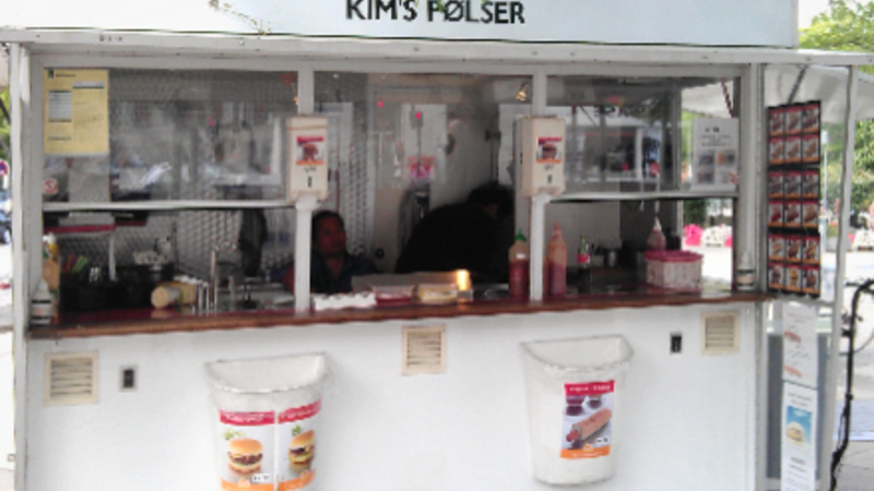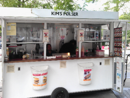 Da jeg kørte forbi Gunnar NU Hansens Plads på Østerbro, fik jeg øje på en pølsebod 'Kims Pølser.'