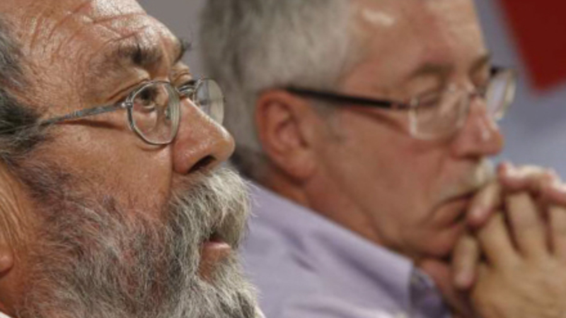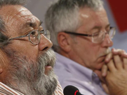 Foto: Generelsekretær for UGT, Candido Mendez, og CCOO, Ignacio Fernández Toxo, under pressekonferencen, hvor de informerede om de kommende protester mod regeringens nedskæringer.