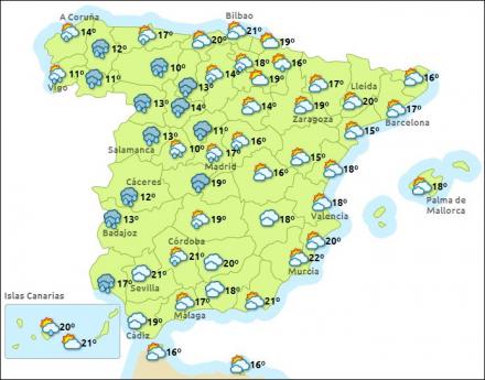 17 provinser er i dag i forhøjet beredskab på grund af regn og blæst. Cáceres og Huelva er i helt oppe i det orange felt på grund af kraftig nedbør, mens De Kanariske Øer, Ávila, Salamanca, Zamora og Orense i er gult.