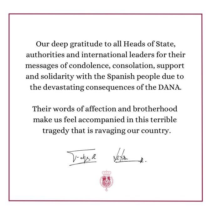Kongehuset takkede for budskaberne om medfølelse, trøst, støtte og solidaritet med det spanske folk for de ødelæggende konsekvenser af katastrofen på sin X-konto på det sociale netværk. “Dine ord om kærlighed og broderskab får os til at føle os ledsaget i denne forfærdelige tragedie, der har ødelagt vores land,” tilføjer beskeden, som den kongelige familie svarer på de mange beskeder om støtte, der er modtaget fra hele verden.