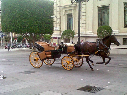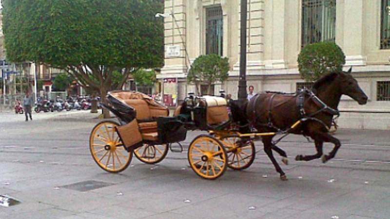 En kusk blev skadet, syv knallerter væltede, og der blev smadret glas og inventar, da en hest i går gik amok og galoperede rundt i Sevillas gader.