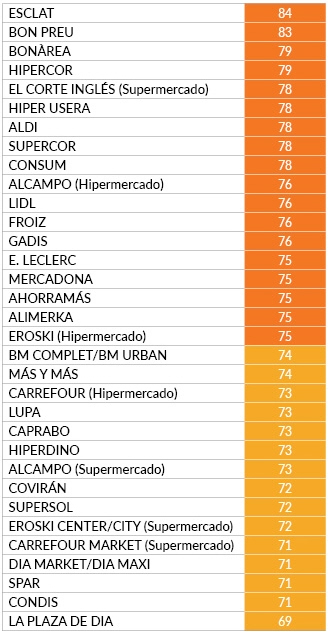 Det regionale supermarked Esclat fører ranglisten over de bedst bedømte supermarkeder med 84 point. Derefter følger Bon Preu (83), BonÁrea (79), Hipercor (79), El Corte Inglés, Hiper Usera, Aldi, Supercor og Consum, (alle med 78 point), Alcampo, Lidl, Froiz og Gadis med 76 point. Mercadona, Eroski og Ahorramas (75) og Carrefour (73).