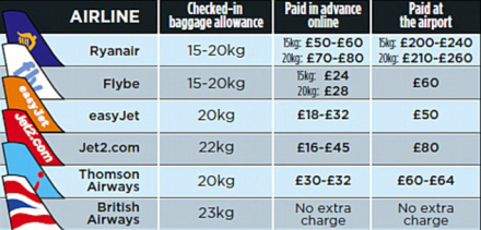 Passagerer betaler minimum 25-35 euro per kuffert ved flyvninger i sommerperioden mellem juni og september samt ved jul og nytår, mens beløbet er på 15-20 euro på andre tidspunkter af året. Og hvis du har for mange kilo med, koster det kassen. Og venter du med at ”købe” bagage til i lufthavnen, kommer det virkelig til at gøre ondt med priser helt op til 280 euro.