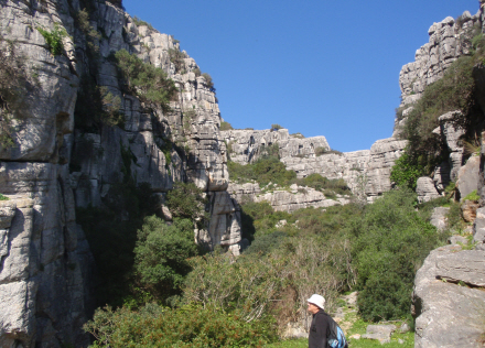 Vi passerer forbi restauranten ”Los Alamos” og parkerer cirka 500 meter inde ad grusvejen efter det lille kapel La Ermita San Adolfo. Turen starter med et stort skilt og kort over El Canuto de la Utrera, hvor stien fortsætter ind i kløften.