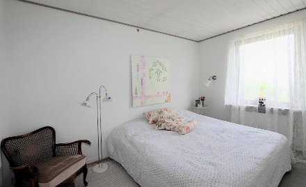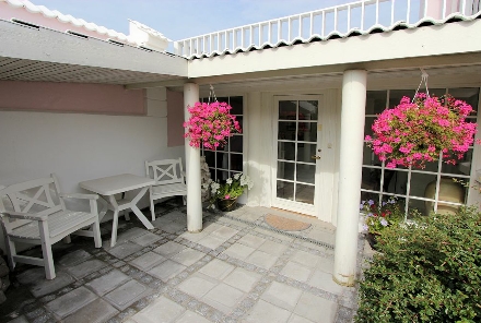 1. sal: repos, lyst soveværelse, badeværelse med klinkegulv, badekar og håndvask nedfældet i skabsarrangement. Stort, lyst værelse med udgang til den pragtfulde tagterrasse.
