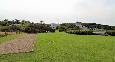 Fra ejendommen krydses den velbeplantede grund for at nå strandkanten, hvor den smukke panoramaudsigt kan nydes fra bænk eller liggestole. Ved strandkanten giver petanque-bane også mulighed for et spil petanque med en udsigt, der nok ikke findes bedre.