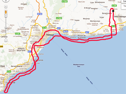Vores tur gik fra Velez-Málaga, henover Fuengirola, ud til El Faro og tilbage igen
