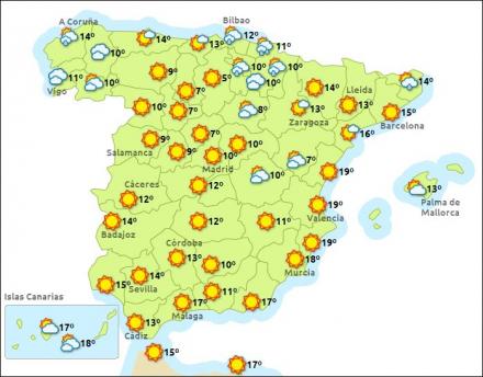 Madrid har i dag fint solskinsvejr med mellem en – 13 grader, Barcelona det samme, men noget varmere med temperaturer på mellem ni – 16 grader, Valencia det samme og mellem ti – 19 grader, og Málaga har ligeledes en fin blå himmel og mellem ni - 18 grader.