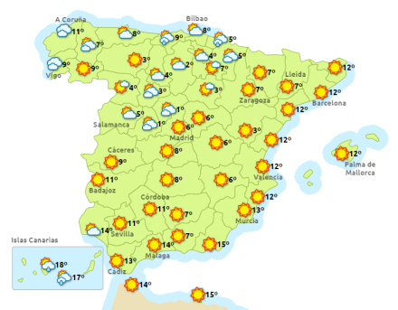 Madrid går på weekend med en flot og solrig fredag. Der vil være solskin fra en blå himmel fra daggry til solnedgang. Det betyder dog på ingen måde høje temperaturer. Husk varmt tøj, hvis du vil ud i Madrids gader, der byder på temperaturer på -2 til 8 grader,