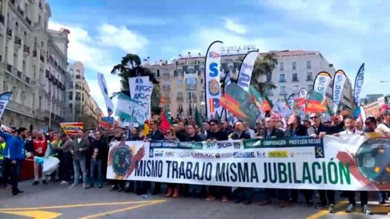 En infernalsk larm med fløjter, tudehorn og kanonslag. Mellem 15 og 40.000 - afhængig af, hvem man spørger - betjente var mødt op til demonstration i Madrid lørdag.