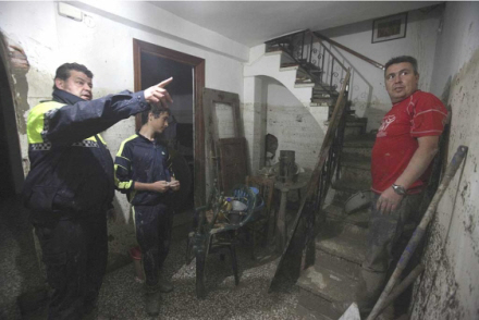 Betjente instruerer en borger i Córdoba om sikkerheden i hans bolig - bemærk hvor højt vandet har stået