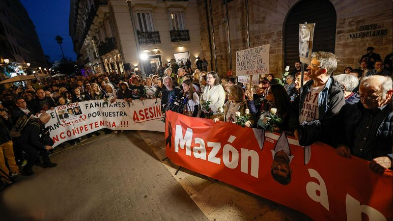 Hundredvis af mennesker samledes den 9. november, præcis et år efter den første demonstration i Valencia på grund af oversvømmelserne, indkaldt af omkring tyve sociale, borgerlige og faglige foreninger. Den første demonstration fandt sted elleve dage efter tragedien under råbet "Mazón, afgang", og demonstrationerne er blevet gentaget en gang om måneden. Det pågældende råb, efter præsidentens afgang sidste mandag, er nu blevet forvandlet til "Mazón, i fængsel og regeringens afgang".