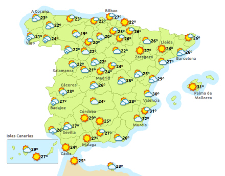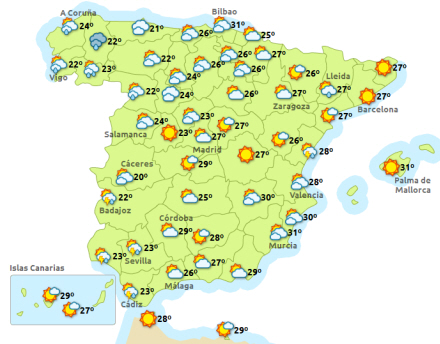 Let stigende dagtemperaturer på De Kanariske Øer, med udsigt til 28 grader i Las Palmas de Gran Canaria og 30 grader i Santa Cruz de Tenerife. Stort set uændret i resten af landet. Langs middelhavskysterne dog en smule køligere.