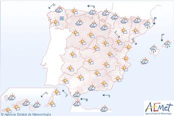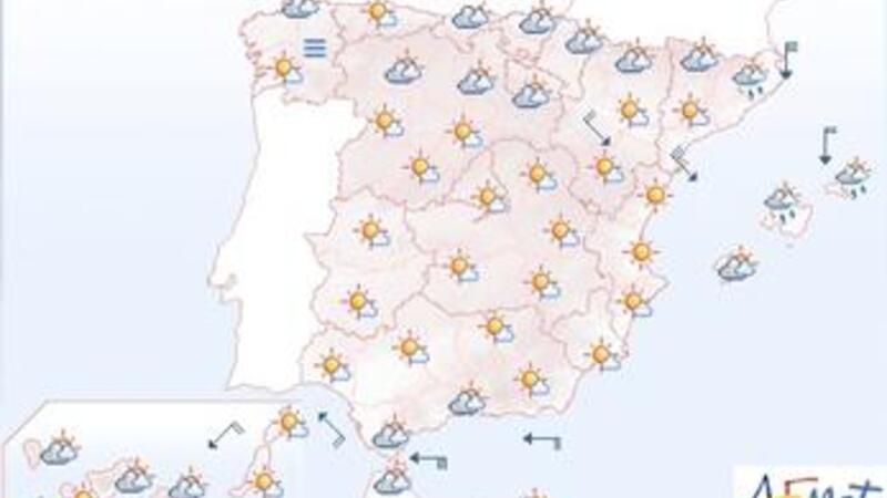 Ved Gibraltar-strædet skyet og mulighed for nedbør. Langs Middelhavskysterne vekslende skydække, men stort set tørt, på Balearerne mulighed for et par enkelte byger. I resten af landet ret solrigt.