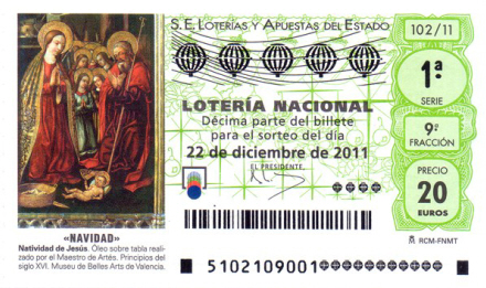 Årets lodseddel her en 'Décimo,' som er en tiendedel af et helt nummer i en bestemt serie. Denne décimo er del nr. 5 og koster 20 euro. Et helt nummer koster 200 euro.
