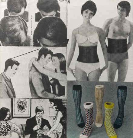 Billeder fra katalog, der opfordrer til at blive den idelle type. Middel til bedre hårpragt, skammel til mand, så han bliver højere end kvinden, de rigtige strømper for at tiltrække mandens opmærksomhed, manden skal også bære korset for at få idealmål og så er der lige tidens strømper...