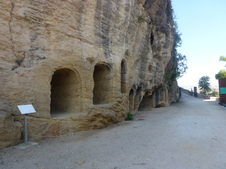 Nu skal vi op og bese borgen og kirken deroppe på toppen, så vi vandrer op ad Plaza de España og forbi byens rådhus, der ligger i et tidligere kloster. På vejen op passerer vi et sted med en masse små kapellignende huller, der er hugget ind i klippen. I Middelalderen blev de brugt som gravpladser.