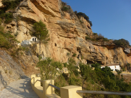 Langs stien er der huler hugget ind i klippen, og foran en af dem er der bygget et helt hus.