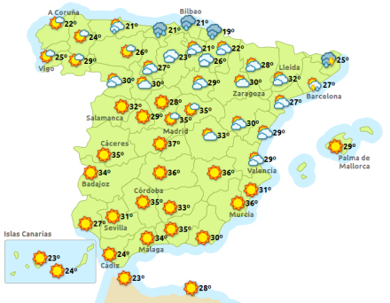 I alt kan hele 28 provinser se frem til havne på den lune side af de 30 grader, og ud af dem er de syv i forhøjet alarmberedskab niveau gul. Det drejer sig om: Madrid (36), Albacete (37), Toledo (38), Cuenca (35), Málaga (36) og Almería (30). Gerona og Barcelona er også i forhøjet alarmberedskab, men her handler det derimod om regn og uvejr.
