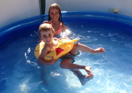 Jeg er så heldig at have en stor tagterrasse, hvor vi min datter Patricia og jeg installerede en lille pool – bare 2,5 meter i diameter med ca. 2,5 m3 vand - inden ungerne kom. Jeg vil gerne give reklamen til Decathlon: 47,95 euro inklusive pumpe, testsæt, klor og algedræber til et par måneder. Jeg måtte dog ved siden af købe produkt til at reducere Ph-værdien.