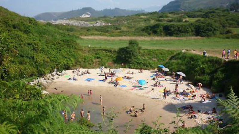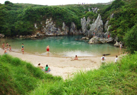 Vandet trænger ind gennem nogle naturlige tunneller, og fosser ned i ”lagunen”, der er omgivet af grønne marker, kun 50 meter fra stranden i Llanes.