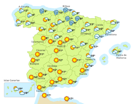 Vinden kommer fra nord og nordvest i det meste af landet, mens der skal regnes med periodevis stærk blæst i Ebro-dalen, Pyrenæerne, nordøst for Gerona, på Balearerne og De Kanariske Øer.