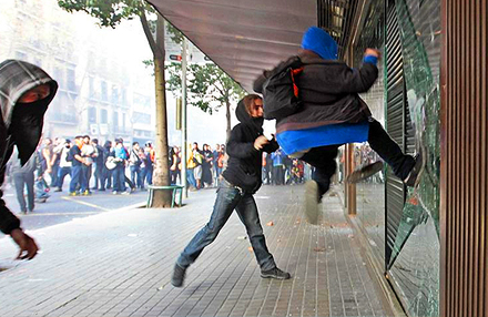 Unge er ved at smadre et vindue i Corte Inglés