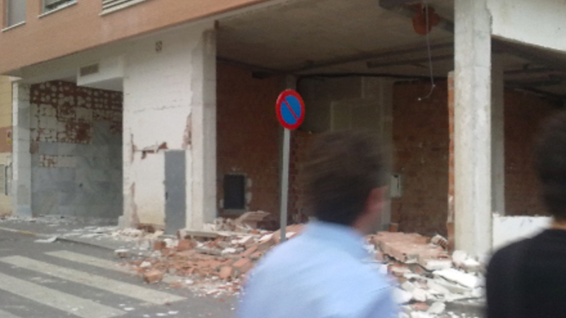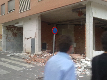 Billedet stammer fra jordskælvet i Lorca og netop her ses, hvorledes den murede væg mellem betonpillerne er styrtet ned på fortovet og gaden
