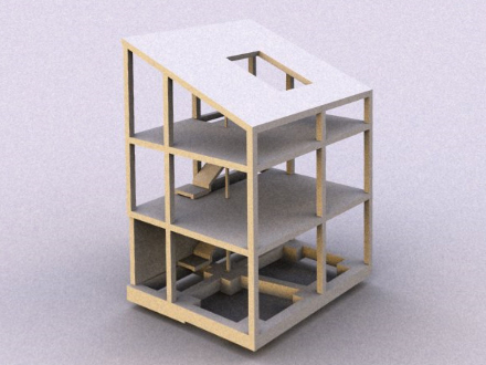 Princippet for den bærende konstruktion udført i jernbeton. Bemærk fundamentspladerne under pillerne og 'trækbjælkerne' mellem dem.