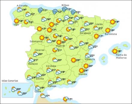 Termometret falder i dag - mest udpræget i Galicien og Cantabrien, mens det stort set fortsat bliver uændret i resten af landet. Der er desuden varslet kraftig blæst i den nordlige del af De Kanariske Øer.
