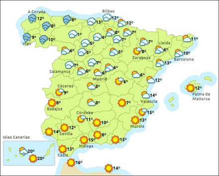 Madrid har i dag skyet vejr med mellem nul og syv grader, Barcelona lidt sol og fem – 11 grader, Valencia letskyet med mellem otte – 15 grader og Málaga letskyet med seks – 14 grader.