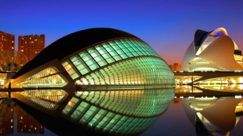 Palau de les Arts blev bygget i 2005 og er den næst nyeste af de i alt seks futuristisk-udseende bygninger, der udgør Valencias Kunst- og videnskabspark.