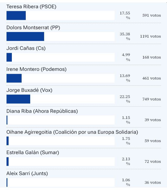 Kampen mellem de største partier varede nogle få sekunder med krydsende beskyldninger, hvor PP’s kandidat sagde til Teresa Ribera, at Europa ikke kan lide regeringer, der er omgivet af korruption. Kandidaten for Ciudadanos, Jordi Cañas, havde opgivet spørgsmålet om Begoña Gómez og sagde, at dette valg ikke handler om Begoña.