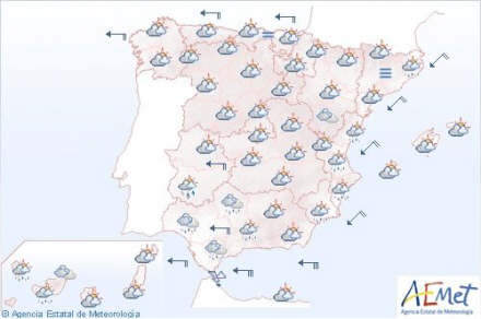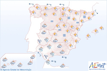 Søndag byder hovedsagelig på tørt vejr med undtagelse af den sydvestlige del af landet, som kan få nogen nedbør – altså blandt andet Málaga Provinsen. Ellers nogen sol, tørt og op til 12 grader.