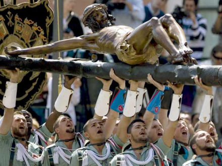 2) Málaga har torsdag sit legendariske optog, når legionærerne bærer rundt på den berømte statue af Cristo de la Buena Muerte fra broderskabet Mena. Tronen stammer tilbage fra 1928, men forsvandt under en afbrænding af kirken i 1931, hvorefter den så blev lavet igen i 1942.