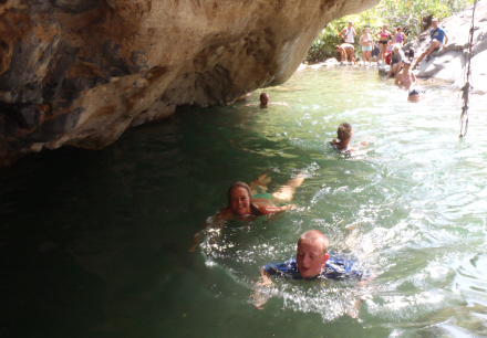 Sidste etape tager et par forsøg for de fleste. Kathrine (uden sko) napper den i ét hug. Vel oppe kunne man godt lige have nydt den forrygende udsigt over slugten - hvis man da ikke lige havde aftalt med Carina og Barbara at tage springet. Der går en lille sti ud til udsigts- og udspringspunktet, og herfra er der laaangt ned – ikke mindst hvis man skal springe – og ikke er helt tryg ved det. Absolut ikke er tryg ved det!