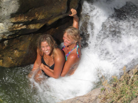Oppe fra den næste lille pøl er der udsigt over søen og bækken. Her gælder det om at holde fast i hinanden for at stå imod trykket fra vandet, der plasker nedad. Det her sted kan vi kalde for “endestationen” for de mindre vovede, for den der vover sig længere op, skal nemlig springe ud fra de syv meter og ned i lagunen.